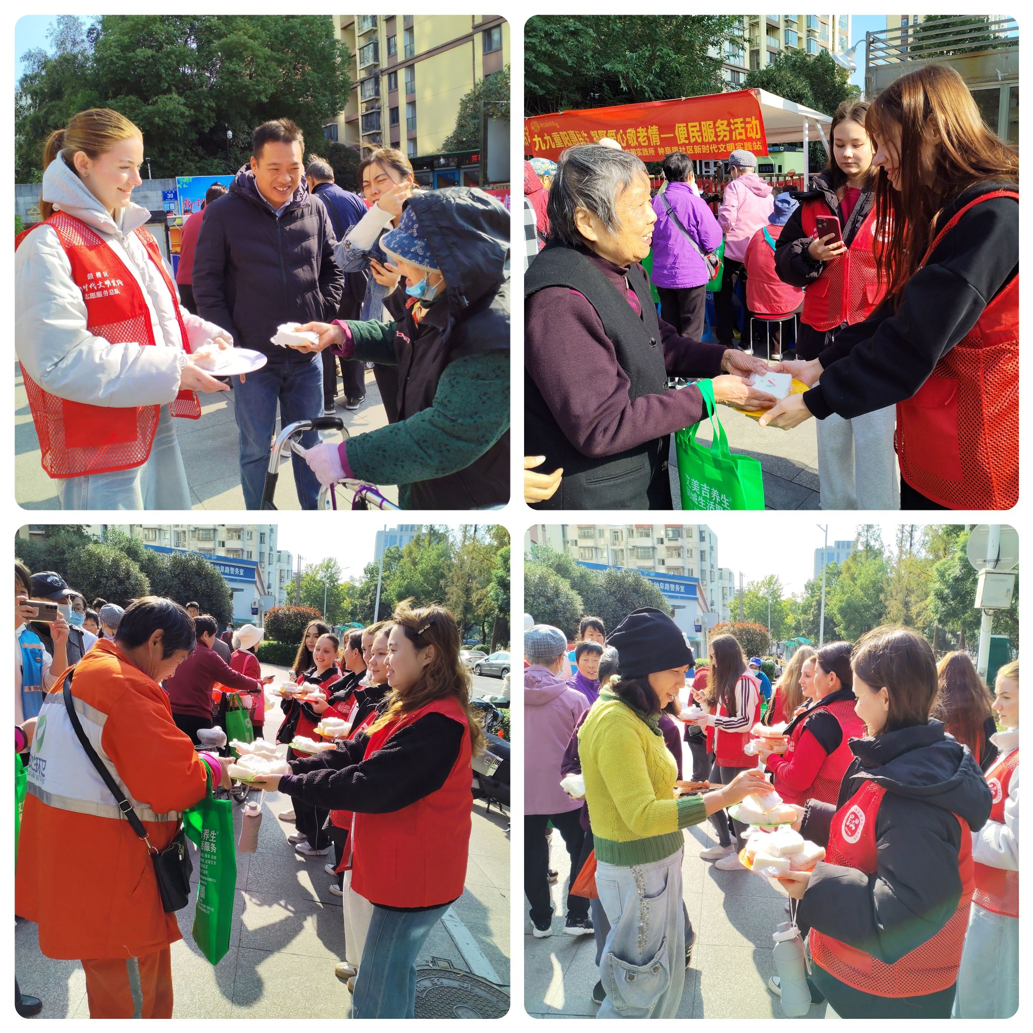 随后,留学生志愿者们分成2人一组,在社区网格员的带领下,开启了走访慰问独居高龄老人的温馨之旅。他们带着真诚的笑容走进老人家中,送上香甜的重阳糕。留学生们用手势比划着与老人们亲切交流,虽然动作略显笨拙,但却充满了真诚与关爱。来自哈萨克斯坦的KHYMRAT ALBINA激动地分享道:“我和白俄罗斯的BUTRIMOVA MILANA组成了一个温暖的小组,我们来到87岁的蒋爷爷家中,为他送上了美味的糕点。爷爷向我们表达真挚的感谢。这次活动让我真切地感受到了中国社会的温暖和善良,尊敬和关爱老人是跨越国界的共同情感。”