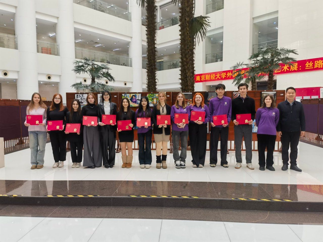 1月6日下午,“丝路新语·同心共绘——我与中国的故事”外国留学生文化艺术展在仙林校区图书馆二楼大厅如约启幕,为冬日校园增添了一抹绚丽的文化色彩。党委常委、副校长方勇出席开幕活动,党委宣传部、党委统战部、学生处、校团委、艺术教育中心、图书馆、国际教育学院等单位相关工作负责人以及外国留学生代表参加开幕活动。